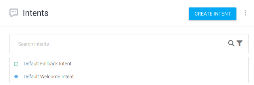 Ya tenemos un agente creado. ¡Vamos a configurarlo! Inicialmente, los agentes tienen dos intents , que son Default Fallback Intent para cuando no entiende lo que ha dicho, y Default Welcome Intent para darle la bienvenida en su primer mensaje.