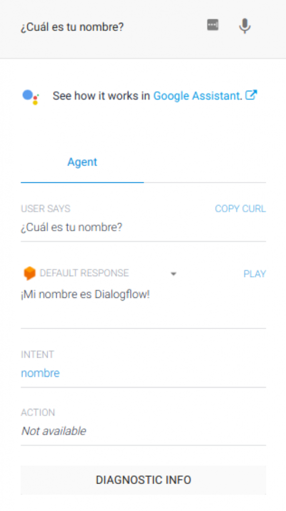 Su respuesta puede ser un poco diferente, mostrando sólo el nombre de la intent. Probablemente el modelo todavía está entrenando. En unos segundos debe funcionar. Si no funciona, revisa los pasos citados y vuelve a intentarlo. Incluso con algunas variaciones en el input que introduzcas, responderá correctamente.