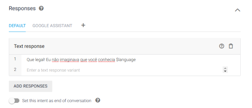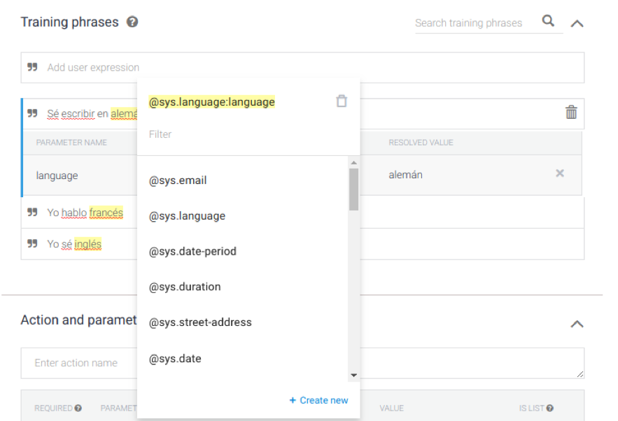 También es posible extraer los parámetros a través de entidades . Crea una nueva intent llamada “idioma” con las siguientes frases: