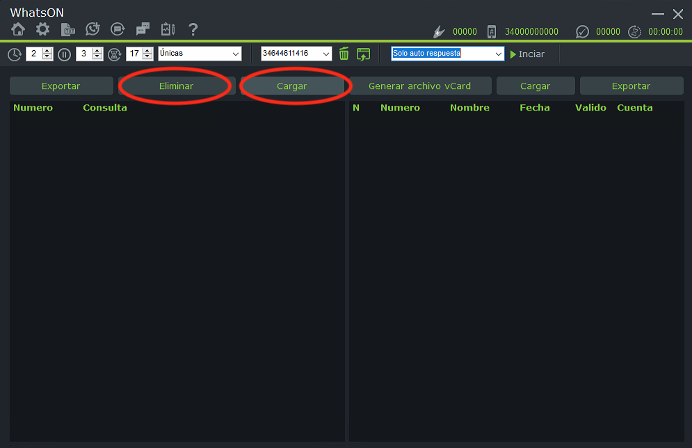 Cargar: pulsando este botón se cargará toda la lista de números a los que WhatsON a enviado la respuesta única, y la respuesta que ha enviado el contacto.