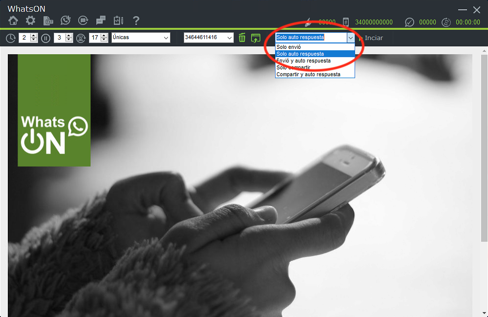 Para poder seguir auto respondiendo es necesario una vez finalizado el envío, poner WhatsON en modo Auto respuesta para ello será necesario seleccionar e inicial el software en modo Solo Auto Respuesta.